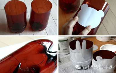 Step 2:将瓶身和底座剪开,上部分不要(或者你也可以用它来做漏斗:P)根据卡纸剪好动物形状(耳朵部分很重要)。